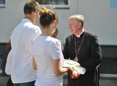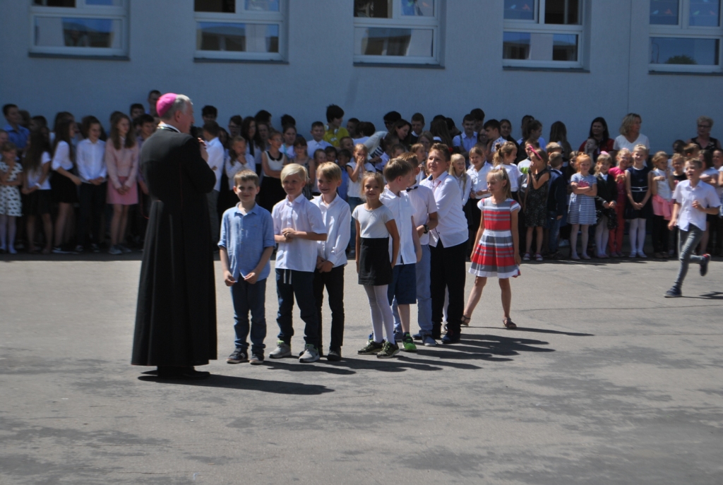 Ksiądz Biskup bardzo chętnie odpowiadał na pytania zadawane przez uczniów. Mogliśmy dowiedzieć się np. że jedną z ulubionych potraw Ksiądza Biskupa z dzieciństwa są gołąbki.