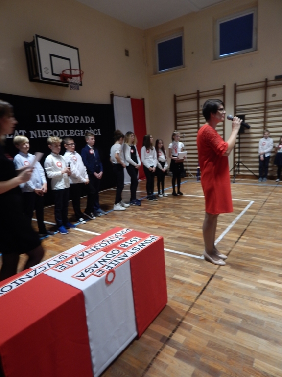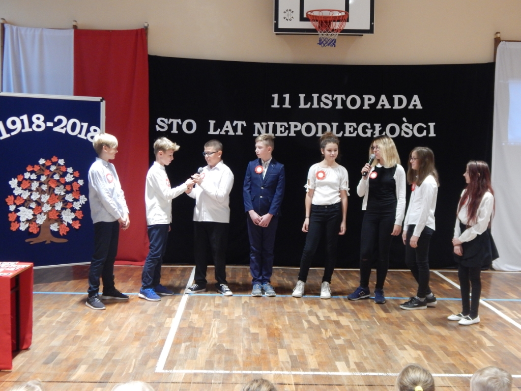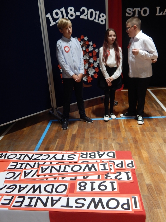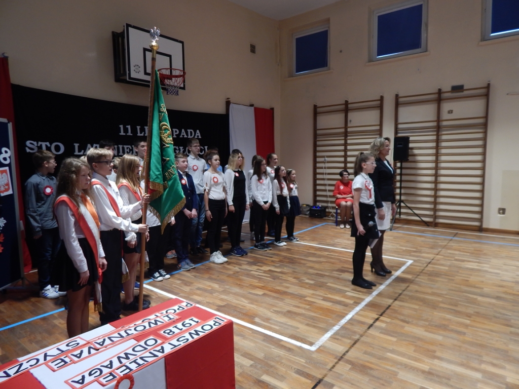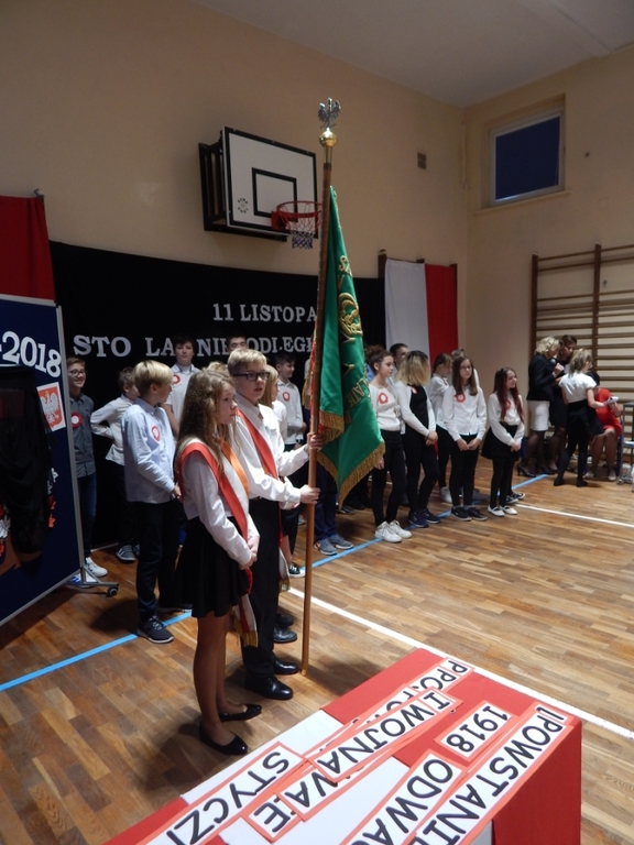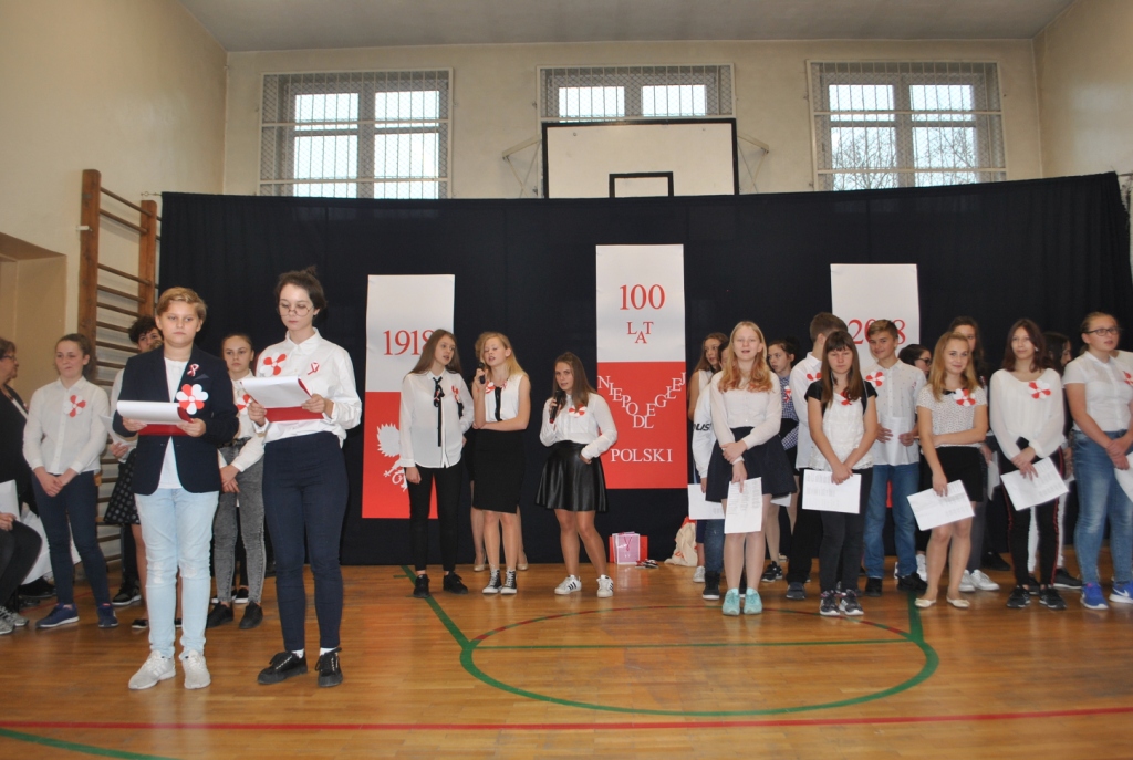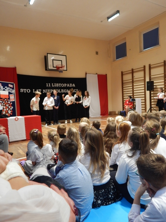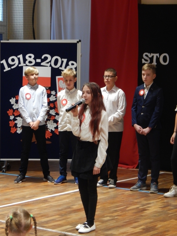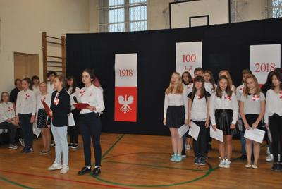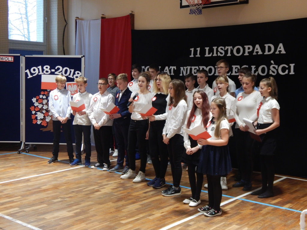 W tej wyjątkowej setnej rocznicy odzyskania przez Polskę niepodległości wzięli udział wszyscy uczniowie naszej szkoły. O symbolicznej godzinie 11.11 wszyscy odśpiewali 4 - zwrotkowy hymn narodowy, włączając się do wspólnej akcji zorganizowanej przez MEN "Rekord dla Niepodległej". Dodatkowo uczniowie klasy VIc przygotowali występ artystyczny, podczas którego upamiętnili heroiczną walkę Polaków o naszą wolność. Oddali hołd i cześć tym, którzy polegli na polu walki. Podziękowali za to, że "tylko z ksiąg historii poznajemy dziś niewolę".